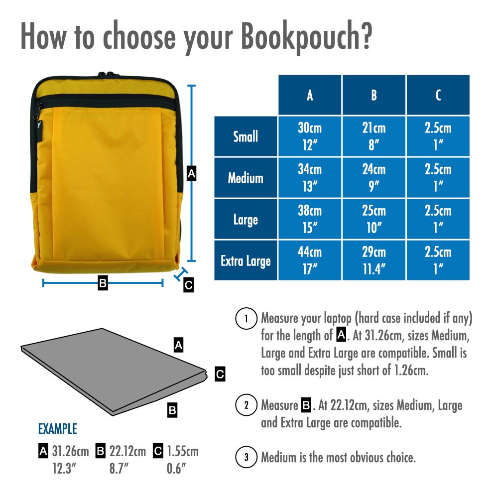 - 1x removable BookPouch with Corduroy lining and iPad/document pocket. Comes in S/M/L sizes and fits most 13"/15"/16" slim laptops.